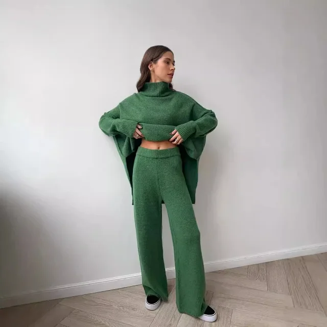 Women's Turtleneck Split Sweater Set, Loose Casual Lazy Knit Pants Two-Piece Set 4